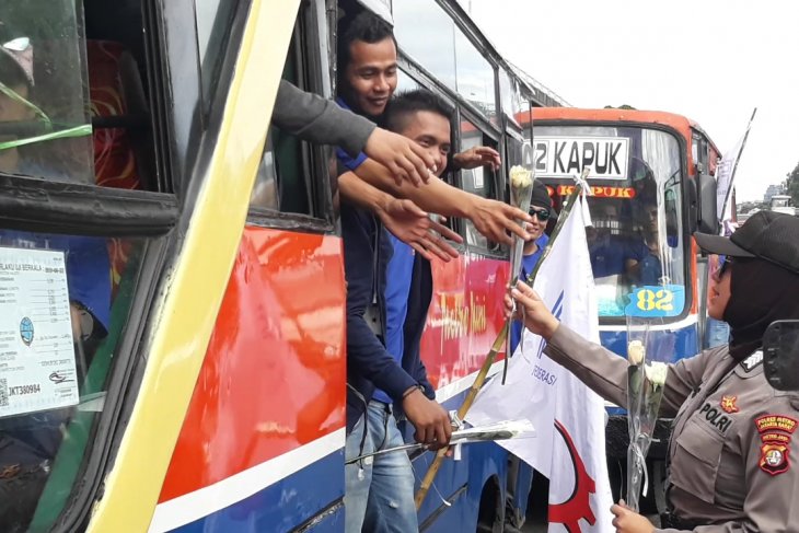 Sejumlah anggota Polisi Wanita (Polwan) Palres Jakarta Barat dengan menggenggam bunga-bunga indah menghentikan sepeda motor dan bus-bus dan yang mengangkut para buruh kembali ke wilayah kerja masing-masing.