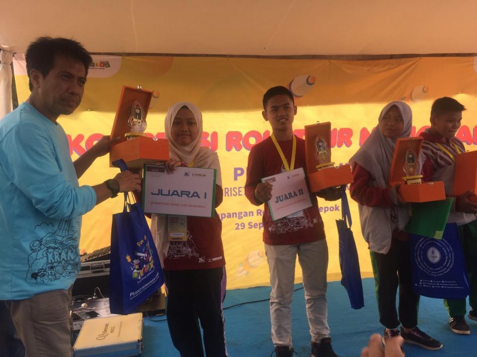 DEPOK (Pos Sore) — Nuti Nawaty Nur, siswa SMA Darul Hijrah Putri, Banjarbaru Kalimantan Selatan keluar sebagai juara pertama dalam Kompetisi Roket Air tingkat Nasional (KRAN) 2019 yang berlangsung di Lapangan Rotunda UI, Depok, Ahad (29/9/2019).