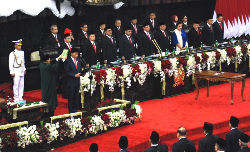 Disaksikan seluruh rakyat Indonesia dan masyarakat dunia melalui ribuan media massa dalam dan luar negeri, MPR RI menggelar Sidang Paripurna Pelantikan Presiden RI Joko Widodo dan Wakil Presiden RI Ma’ruf Amin Masa Jabatan 2019-2024, di Gedung Nusantara, Kompleks Parlemen, Jakarta, Minggu (20/10/2019). Hadir dalam sidang tersebut Wapres RI Periode 2014-2019 Jusuf Kalla.
