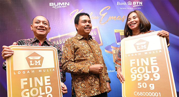 JAKARTA (Pos Sore.com) – Direktur Consumer Banking PT Bank Tabungan Negara (Persero) Tbk. Budi Satria (tengah) , didampingi Wealth Management Division Head, Sri RM Sudarsari (kanan) dan Retail Funding &Service Division Head Ferry Sipahutar (kiri) menunjukkan “mock up” kepingan emas saat acara peluncuran program tabungan berhadiah bertajuk “Kemilau Emas” di Jakarta, Kamis (31/10/2019). Bank BTN menargetkan dapat meraup dana segar untuk memupuk Dana Pihak Ketiga dari segmen ritel sebesar Rp 3 triliun dari program Kemilau Emas yang digelar dari awal November hingga akhir Desember 2019. B. Tri Prasetyo.