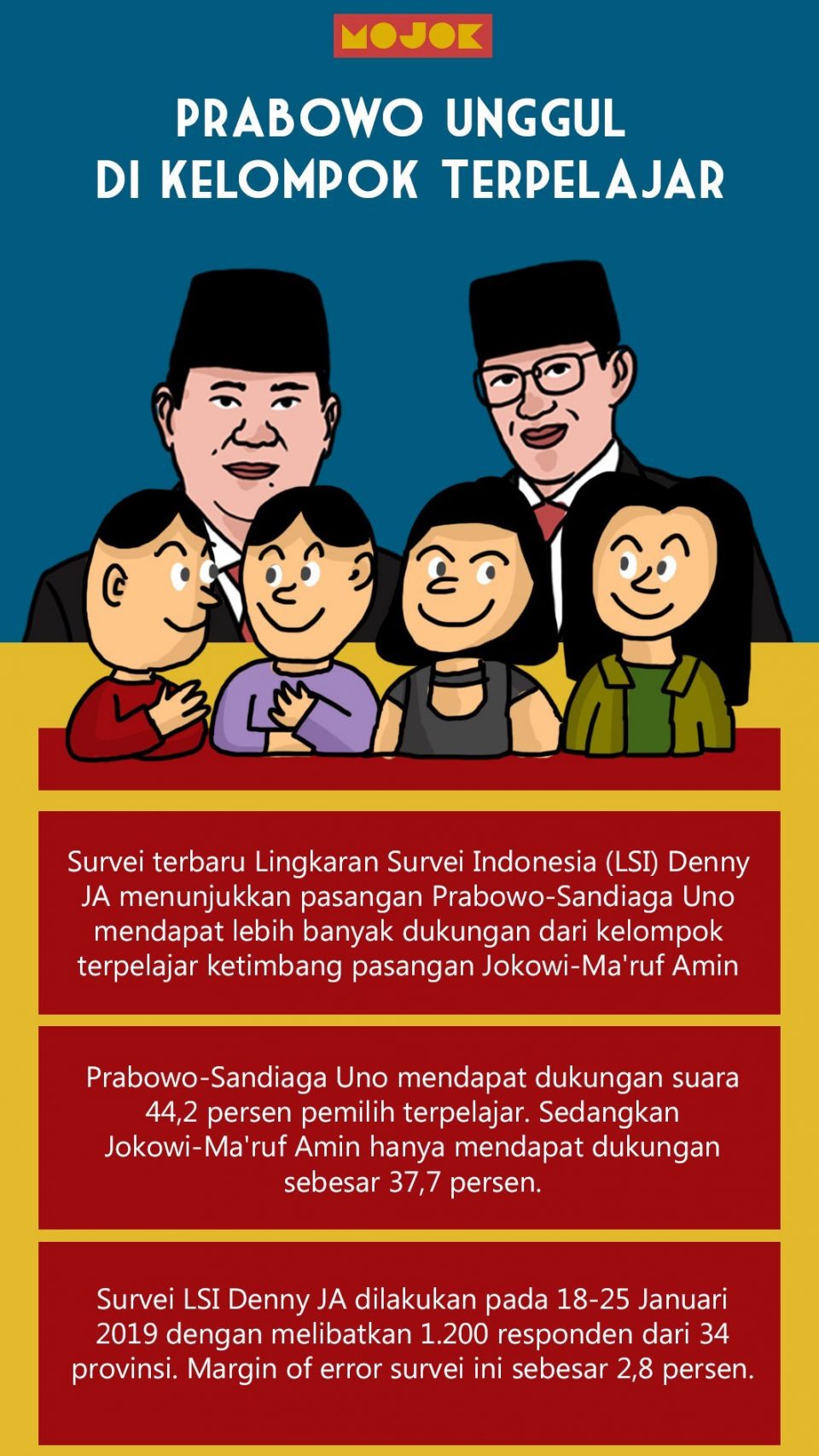 Hasil survei tersebut disampaikan langsung oleh peneliti LSI Denny JA, Adjie Alfaraby. Ia mengatakan bahwa di segmen pemilih terpelajar, pasangan Prabowo-Sandiaga mendapatkan dukungan suara 44,2 persen, sedangkan Pasangan Jokowi-Ma’ruf Amin mendapatkan 37,7 persen.