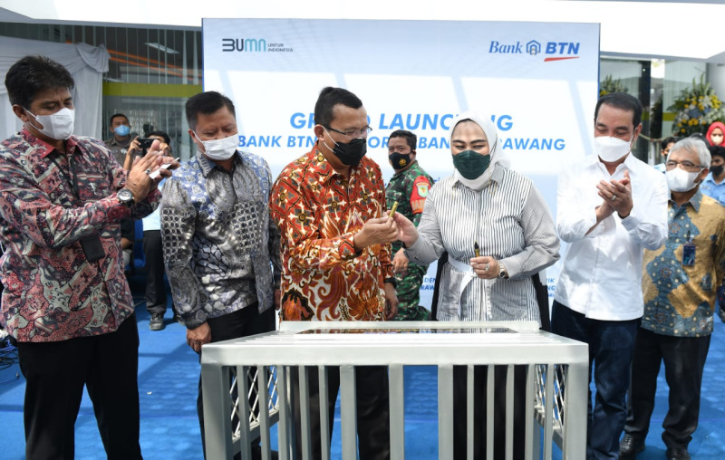 JAKARTA (Possore.com) -Direktur Utama Bank BTN Haru Koesmahargyo dan Bupati Karawang Cellica Nurrachadiana(ketiga kanan) menandatangani prasasti peresmian Gedung Kantor Cabang Bank BTN Karawang didampingi Direktur Distribution and Retail Funding Jasmin (Kanan), Kepala Kantor Wilayah I Bank BTN Edward Alimin Syarif(kiri), Anggota Komisi XI DPR Fauzi H Amro (kedua kanan) dan Anggota Komisi XI DPR Bertu Merlas (kedua kiri), di Kabupaten Karawang, Jawa Barat, Jumat (28/1). Peresmian Kantor Cabang Bank BTN Karawang ini akan membuat perseroan semakin ekspansif dalam menggali potensi bisnis di daerah tersebut baik pendanaan maupun kredit khusus pembiayaan perumahan. B. Tri Prasetyo