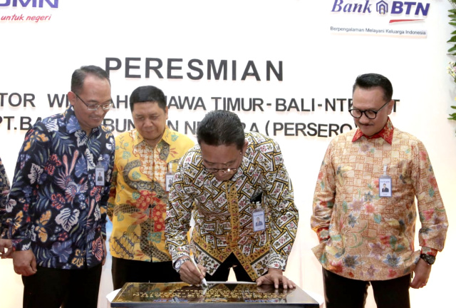 1. SURABAYA (PosSore.com) – Direktur Network & Distribution PT Bank Tabungan Negara (Persero) Tbk. Dasuki Amsir (tengah) menandatangani prasasti terkait relokasi Kantor wilayah III Bank BTN disaksikan jajaran manajemen Kantor Cabang Bank BTN diantaranya Branch Manager Madiun,Indrasakti Agung (kiri), Kepala Divisi Service Quality and Network Division,Nasril (kedua dari kiri) dan Kepala Kanwil III, Frisaba Hengky Yusdianto (kanan) di Surabaya, Jawa Timur, Kamis (7/11/2019). Relokasi Kantor Wilayah III Bank BTN ke tempat yang baru diharapkan dapat memacu kinerja dan layanan perbankan khususnya di Wilayah III Bank BTN yang menaungi outlet di provinsi Bali, Jawa Timur, NTB dan NTT. Relokasi tersebut juga diharapkan dapat mempercepat target perolehan Dana Pihak Ketiga tahun 2019 yang dipatok Rp 22 triliun dan kredit yang disalurkan mencapai Rp 29 triliun. B. Tri Prasetyo