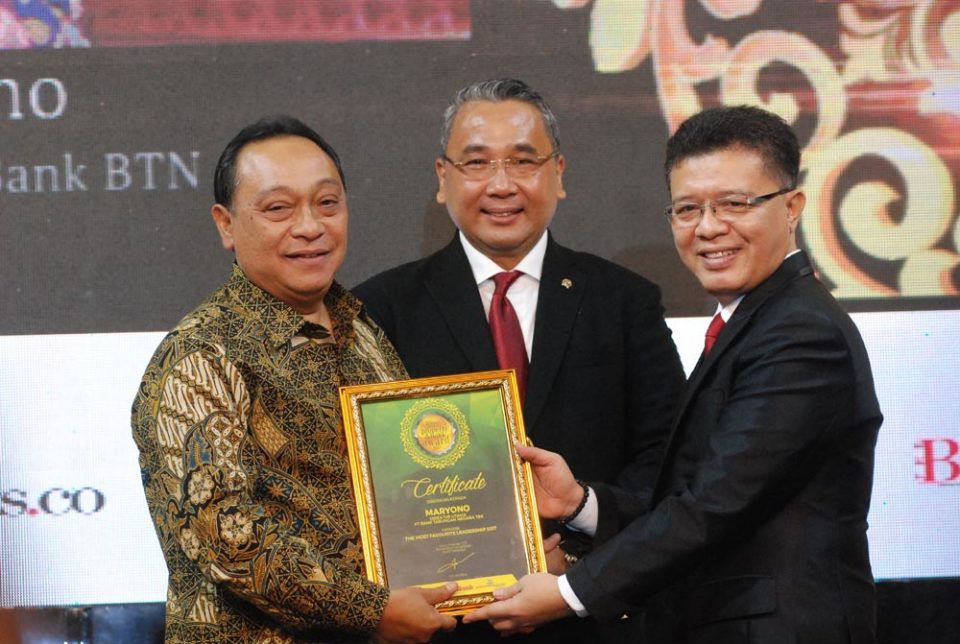 JAKARTA (Pos Sore)-Direktur Utama PT Bank Tabungan Negara (Persero) Tbk. Maryono menerima penghargaan dari Menteri Desa, Pembangunan Daerah Tertinggal, dan Transmigrasi Eko Putro Sandjojo di Jakarta, Kamis (9/11). Bank BTN berhasil meraih penghargaan sebagai Bank Berkinerja Sangat Baik atas kinerja perseroan pada tahun lalu. Selain itu, Maryono pun menyabet Most Favorite Leadership atas kiprahnya memimpin Bank BTN sebagai bank dengan pangsa KPR terbesar dan di dunia properti. Bank BTN berkomitmen untuk melanjutkan kinerja bisnis yang positif dan berkelanjutan serta mengutamakan asas kehati-hatian.(Bambang Tri P),
