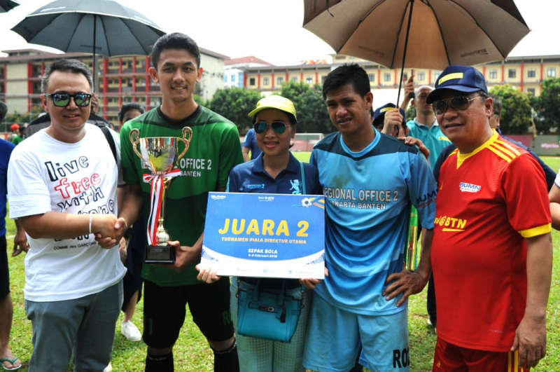 JAKARTA(Pos Sore.com)- Pertandingan Bola – Direktur Utama Bank Btn Maryono bersama Direktur Bank BTN Oni Febriarto menyerahkan piala kepada pemenang pertandingan sepak bola, di Jakarta, Selasa (5/2). Sepak bola menjadi salah satu cabang olah raga yang turut dipertandingkan dalam rangka peringatan HUT ke69 Bank BTN yang jatuh pada tanggal 9 Februari mendatang. Direktur Utama Bank BTN Maryono bersama jajaran Direksi lainnya turut bermain sepak bola melawan mantan pemain Timnas sebelum pertandingan final yang diikuti oleh Kantor Wilayah BTN dan Kantor Pusat di lapangan PTIK . Final sepak bola ini memperebutkan piala Direktur utama BTN. Bambang Tri