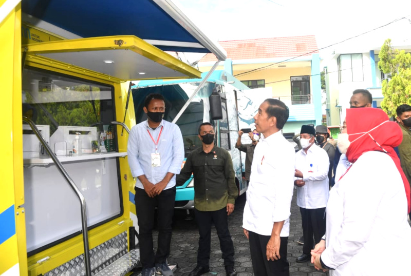 MALUKU UTARA(Possore.com) -Presiden Jokowi didampingi Menteri Ketenagakerjaan Ida Fauziyah menyaksikan peserta penerima Bantuan Subsidi Upah (BSU) melakukan penarikan dana melalui ATM pada Mobil Kas Keliling (MKK) Bank BTN di Ternate, Maluku Utara, Selasa (27/9). Presiden Jokowi mengapresiasi komitmen Bank BTN untuk menyalurkan BSU kepada para pekerja sebagai kompensasi kenaikan harga Bahan Bakar Minyak (BBM). Hingga saat ini Bank BTN sudan menyalurkan BSU kepada 467.856 pekerja senilai Rp280 miliar. B. Tri Prasetyo