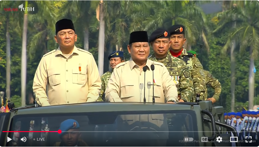Presiden Prabowo didampingi Menhan Sjafrie Sjamsoedin dan Panglima TNI Jenderal Agus Subiyanto melakukan pengecekan pasukan pada HUT TNI 80 di Monas.// Tangkap Layar Setpres