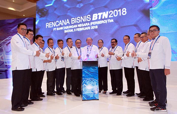 Direktur utama Bank BTN Maryono dan Komisaris Utama Bank BTN I Wayan Agus Mertayasa beserta seluruh jajaran direksi dan komisaris BTN membuka langsung raker BTN 2018 di Batam, Senin (5/2). (bambang tri)