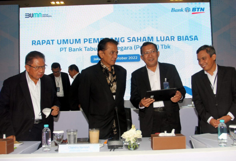 JAKARTA (Possore.com) -Direktur Utama Bank BTN Haru Koesmahargyo bersama Wakil Direktur Utama Bank BTN Nixon LP Napitulu, Komisaris Utama Bank BTN Chandra Hamzah dan Wakil Komisaris Utama Bank BTN Iqbal Latanro berbincang di sela Rapat Umum Pemegang Saham Luar Biasa (RUPSB) Bank BTN di Jakarta, Selasa (18/10). RUPSLB Bank BTN menyetujui penerbitan saham baru melalui skema Hak Memesan Efek Terlebih Dahulu (HMETD) atau rights issue sebanyak-banyaknya 4,6 miliar saham Seri B dengan nilai nominal Rp500 per saham. Bank BTN akan menggunakan dana hasil rights issue untuk meningkatkan kapasitas perseroan dalam penyaluran kredit untuk mendukung Program Perumahan Nasional, khususnya Program Pemerintah Sejuta Rumah. B. Tri Prasetyo