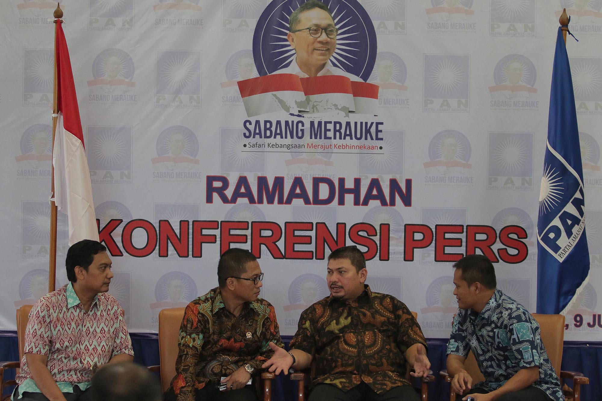 JAKARTA (Pos Sore)- Ketua Fraksi Partai Amanat Nasional (PAN) Mulfahri Harahap didampingi Sekretaris Fraksi Yandri Susanto, Ketua DPP Azis Subekti, dan Anggota Fraksi PAN Budi Youyastri berbincang sebelum memberikan keterangan terkait Safari Ramadan PAN, di Kompleks Parlemen Senayan, Jakarta, Kamis (9/6).