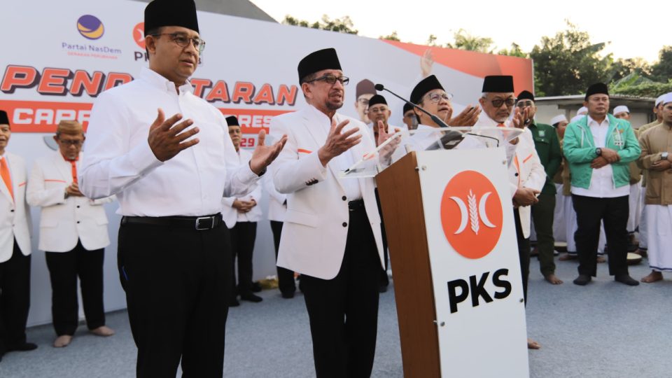 Didampingi para petinggi PKS, pasangan AMIN memanjatkan doa ke hadirat Allah SWT, sebelum melangkahkan kaki ke kantor KUP Pusat.//Foto: tvOne.com