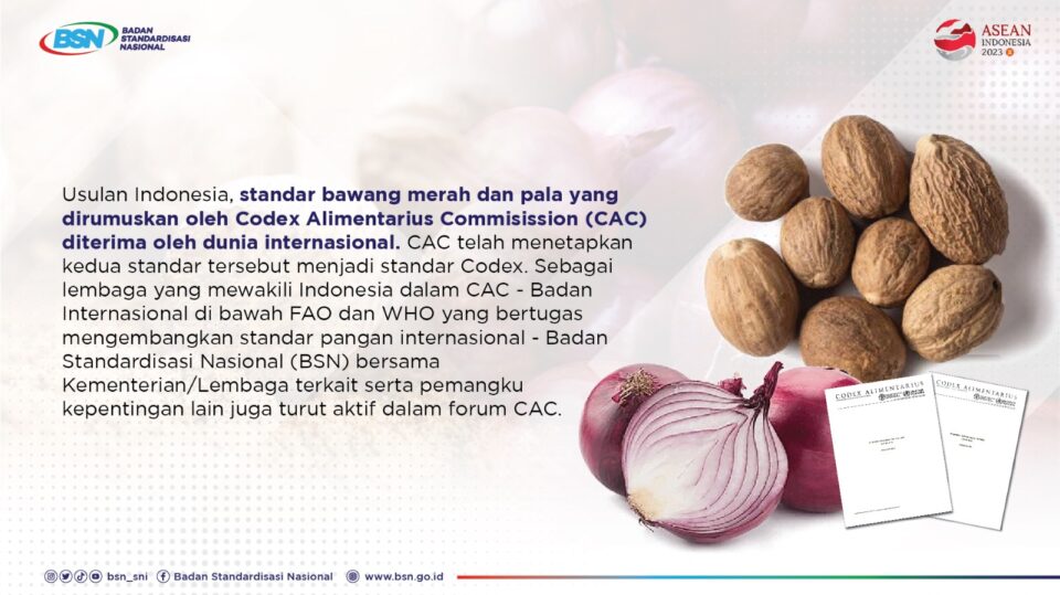 JAKARTA (Possore.id) — Usulan Indonesia, standar bawang merah dan pala yang dirumuskan oleh Codex Alimentarius Commisission (CAC) diterima oleh dunia internasional. Codex telah menetapkan kedua standar tersebut menjadi standar Codex.