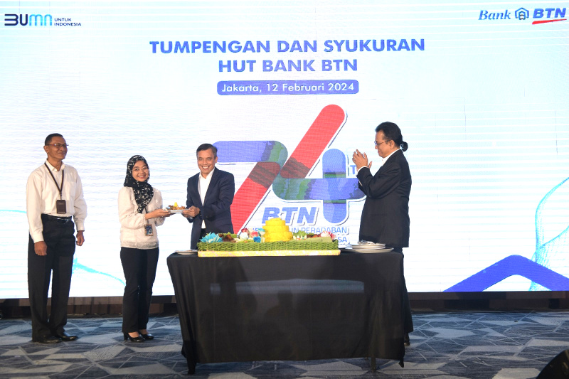JAKARTA(Possore.id) -Direktur Utama BTN Nixon LP Napitupulu disaksikan Komisaris Utama BTN Chandra M Hamzah memberikan potongan nasi tumpeng kepada karyawan termuda BTN dalam acara Tumpengan dan Syukuran Perayaan HUT BTN ke-74 di Jakarta, Senin (12/2/2024). Dalam usianya yang ke-74 tahun, BTN telah berhasil mengemban amanah melakukan pembiayaan perumahan khususnya bagi masyarakat berpenghasilan rendah (MBR). Dari total 5,2 juta unit rumah yang telah dibiayai BTN selama 74 tahun, sekitar 4,05 juta dinikmati oleh MBR melalui fasilitas KPR Subsidi.